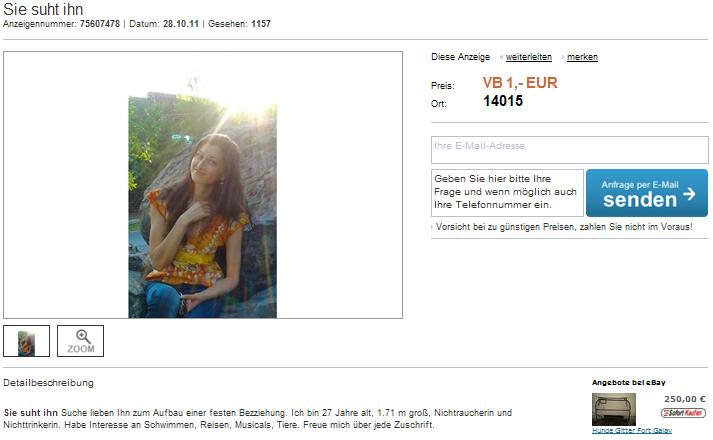 Sie suht ihn Suche lieben Ihn zum Aufbau einer festen Bezziehung. Ich bin 27 Jahre alt, 1.71 m groß, Nichtraucherin und Nichttrinkerin. Habe Interesse an Schwimmen, Reisen, Musicals, Tiere. Freue mich über jede Zuschrift.