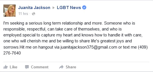 I'm seeking a serious long term relationship and more. Someone who is responsible, respectful, can take care of themselves, and who is employed.special to capture my heart and knows how to handle it with care, one who will cherish me and be willing to share life's greatest joys and sorrows.Hit me on hangout via juanitajackson375@gmail.com or text me (409) 276-7640