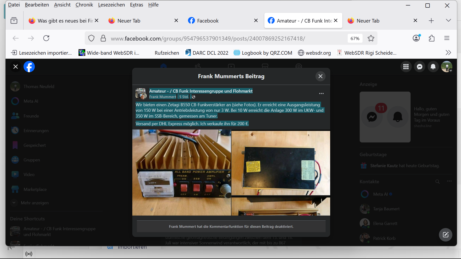 https://www.facebook.com/profile.php?id=100091128303288 Hallo, interessiere mich für den FT 847, wo ist dein QTH? Versand ist vor Weihnachten immer so eine Sache, weil man nicht weiß ob einer ein Weihnachtsgeschenk braucht HI, ich wohne in der Näche von Hameln, Schönen Abend 73 xxxxx