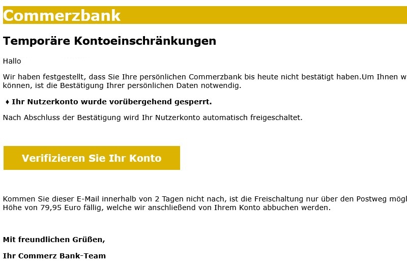 Wir haben festgestellt, dass Sie Ihre persönlichen Commerzbank bis heute nicht bestätigt haben.Um Ihnen weiterhin einen sicheren Service anbieten zu können, ist die Bestätigung Ihrer persönlichen Daten notwendig.